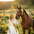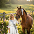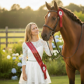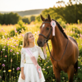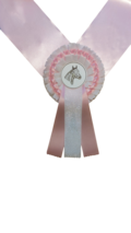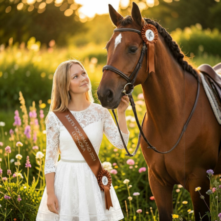 Sættet består af et flot ordensbånd med roset til konfirmanden samt en matchende roset til hesten! Ordensbåndet bæres over skulderen og samles ved hoften i en roset.