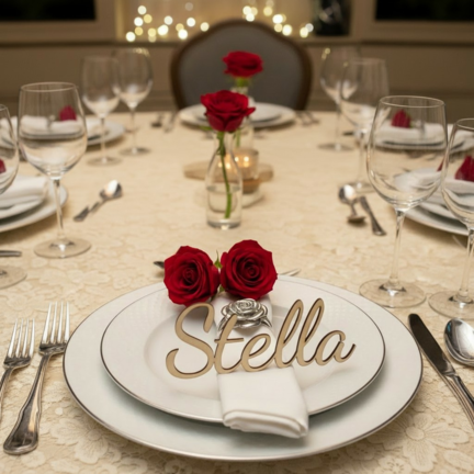 De udskårne navne i træ giver et let og elegant udtryk og løfter bordet med en personlig detalje.